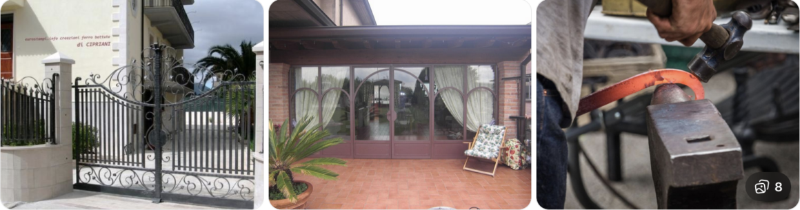 Le lavorazioni in ferro battuto includono una vasta gamma di prodotti: cancelli artistici, ringhiere decorative, inferriate di sicurezza, parapetti, strutture ornamentali e dettagli su misura per interni ed esterni. Ogni elemento viene realizzato attraverso tecniche tradizionali di forgiatura, che permettono di modellare il ferro con precisione e creatività.