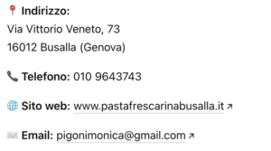 La Pasta Fresca Rina S.A.S. di Agnese Bellina è una realtà artigianale storica situata a Busalla, in provincia di Genova, precisamente in Via Vittorio Veneto 73, nel cuore della Val Scrivia. L’attività rappresenta da anni un punto di riferimento per la produzione e vendita di pasta fresca ligure fatta a mano, mantenendo viva una tradizione gastronomica autentica, radicata nel territorio e tramandata con passione.